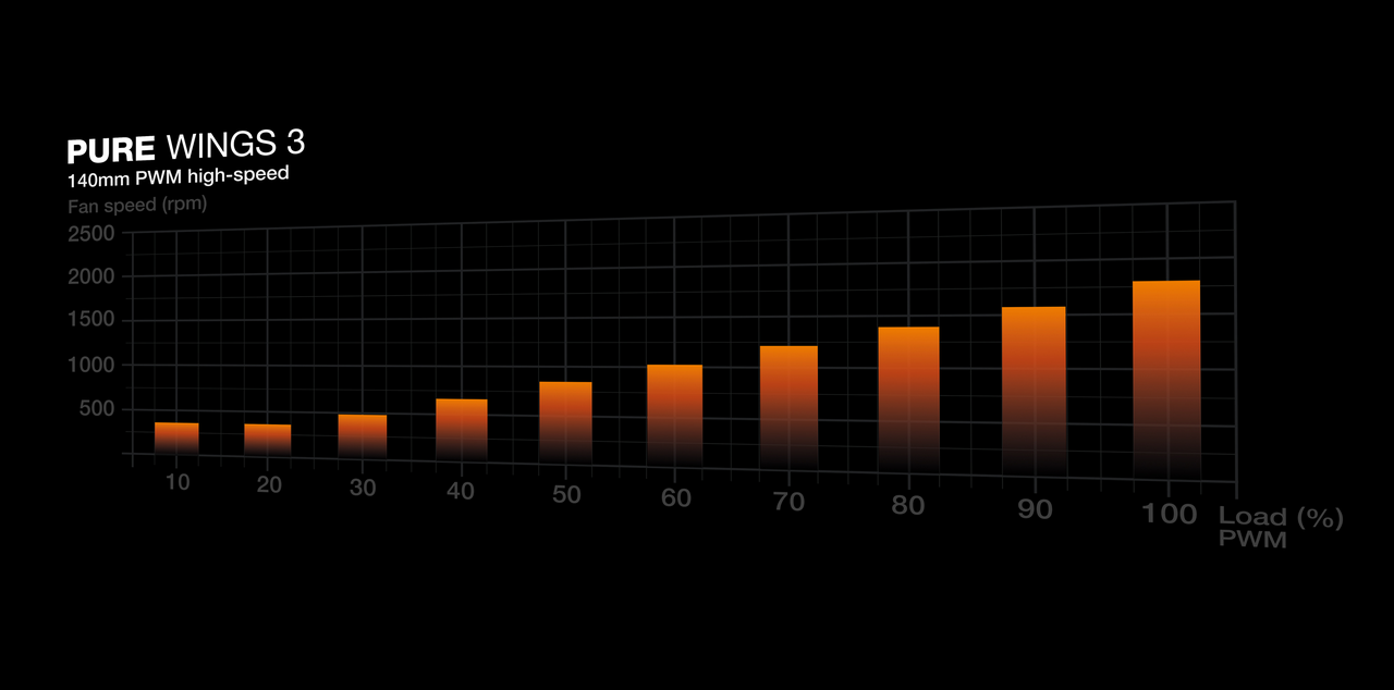 Pure Wings 3 140 mm PWM high-speed White 采用闭环马达。这项技术可与汽车的自动巡航系统相媲美。 当风扇工作时受到阻力(如风扇格栅或散热器),风扇转速会因此变慢,但闭环马达技术可持续监控当前风扇转速,并在必要时将其提高到目标转速。因此,无论阻力如何, Pure Wings 3 140 mm PWM high-speed 始终以理想的速度运行。