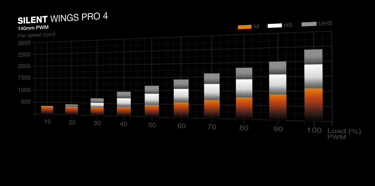 Přepínač rychlosti umožňuje rychle a snadno volit mezi střední, vysokou a ultra vysokou úrovní maximálních otáček (RPM). Silent Wings Pro 4 140mm PWM mění své využití snadným posunutím přepínače doprava. Střední úroveň se hodí pro všechny operace, které vyžadují pravidelné chlazení. Na vysokou úroveň se ventilátor točí rychleji a má vyšší chladící výkon. Ultra vysoká úroveň nabízí dostatek otáček k uchlazení i nejnáročnějšího hardwaru ve špičkových PC sestavách.