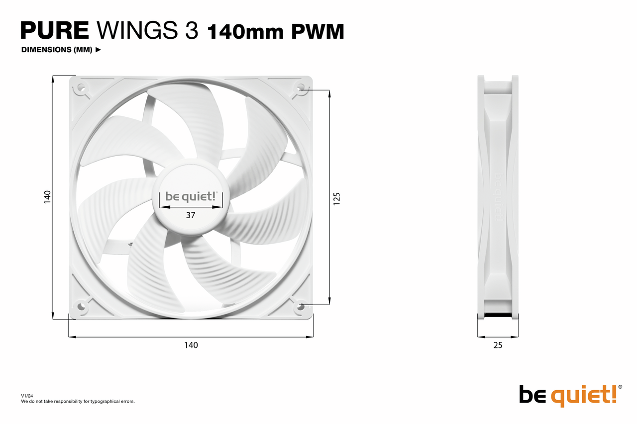 Pure Wings 3 140mm PWM White se zbavuje všech zbytečností. Každá součástka a každý detail přispívají k funkčnosti a nekompromisnímu výkonu. To bylo zohledněno i při návrhu ventilátoru. Všechny hrany a úhly slouží svému účelu, díky čemuž je Pure Wings 3 140mm PWM White nadčasovou klasikou a elegantním doplňkem každého herního počítače. Tento ventilátor, vyvedený zcela v bílé barvě, se hodí zejména pro bílé PC sestavy.