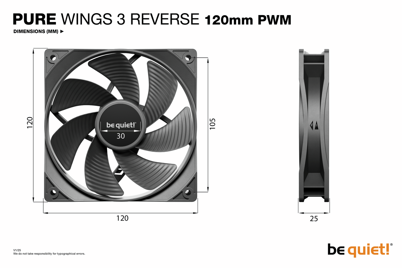 Díky nízkým minimálním otáčkám a obráceným lopatkám jsou Pure Wings 3 120mm PWM Reverse Triple Pack perfektní volbou pro postranní nebo spodní sání vzduchu. Ventilátor nabízí vynikající spolehlivost a je parťákem pro vaši sestavu na dlouhou dobu.