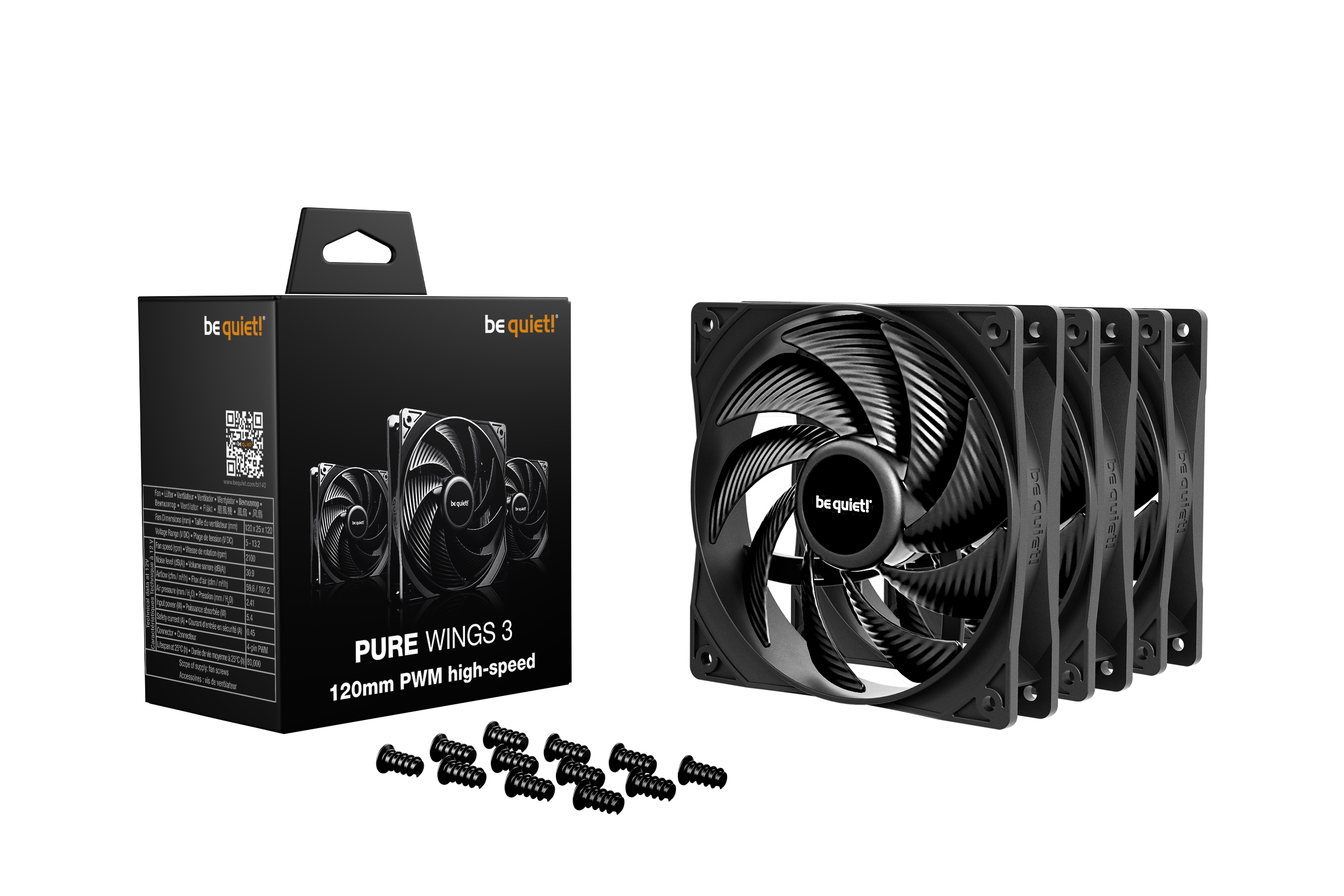 Pure Wings 3 120mm PWM high-speed Triple Pack jsou perfektním doplňkem pro náročná PC s mimořádně vysokou výkonností a pokrokovými funkcemi, jako je motor s uzavřenou smyčkou regulující rychlost.