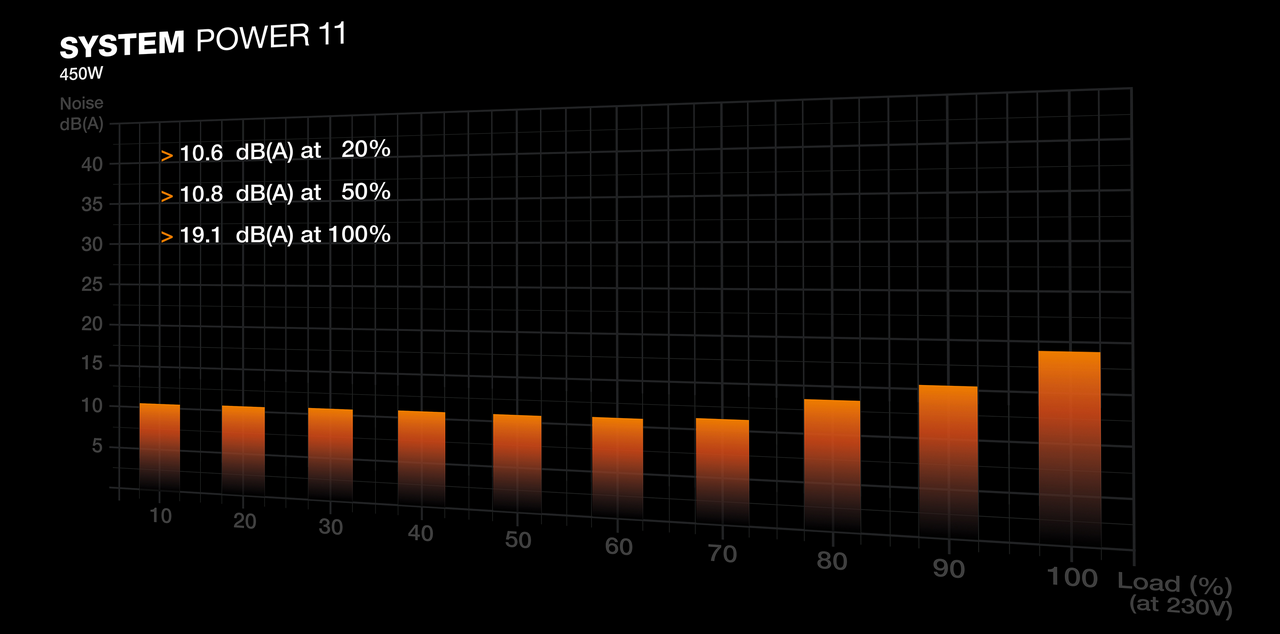 System Power 11 450W je vybaven kvalitním teplotně řízeným 120mm ventilátorem. Zajišťuje nízkou hlučnost chodu, kterou se be quiet! proslavilo, a nabízí pozoruhodnou tichost pro tuto cenovou hladinu.