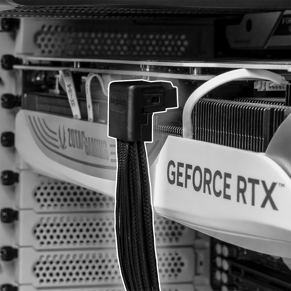 Das schlanke und komplett schwarze 12V-2x6 / 12VHPWR 90°-Reversed-Kabel hat einen abgewinkelten Stecker auf einer Seite für ein einfacheres Kabelmanagement mit jedem ATX 3.1 / ATX 3.0 Netzteil von be quiet!. Dank Kabelummantelung ist es die perfekte Mischung aus Ästhetik und Funktion.