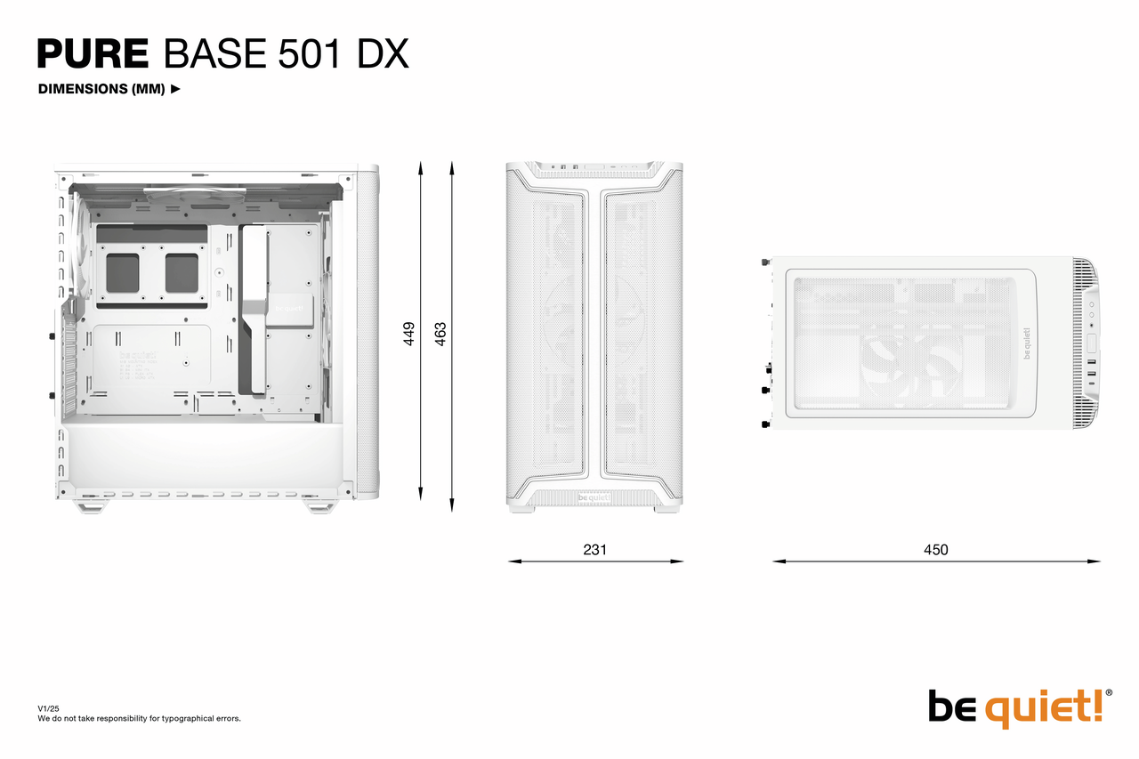 Trotz seiner kompakten Abmessungen bietet Pure Base 501 DX White genug Platz für High-End Grafikkarten und große Kühler. Die Front fasst bis zu 3 Lüfter oder einen 360mm-Radiator, während im Deckel ebenso entweder 2 Lüfter oder ein Radiator bis zu 240mm Platz finden.
