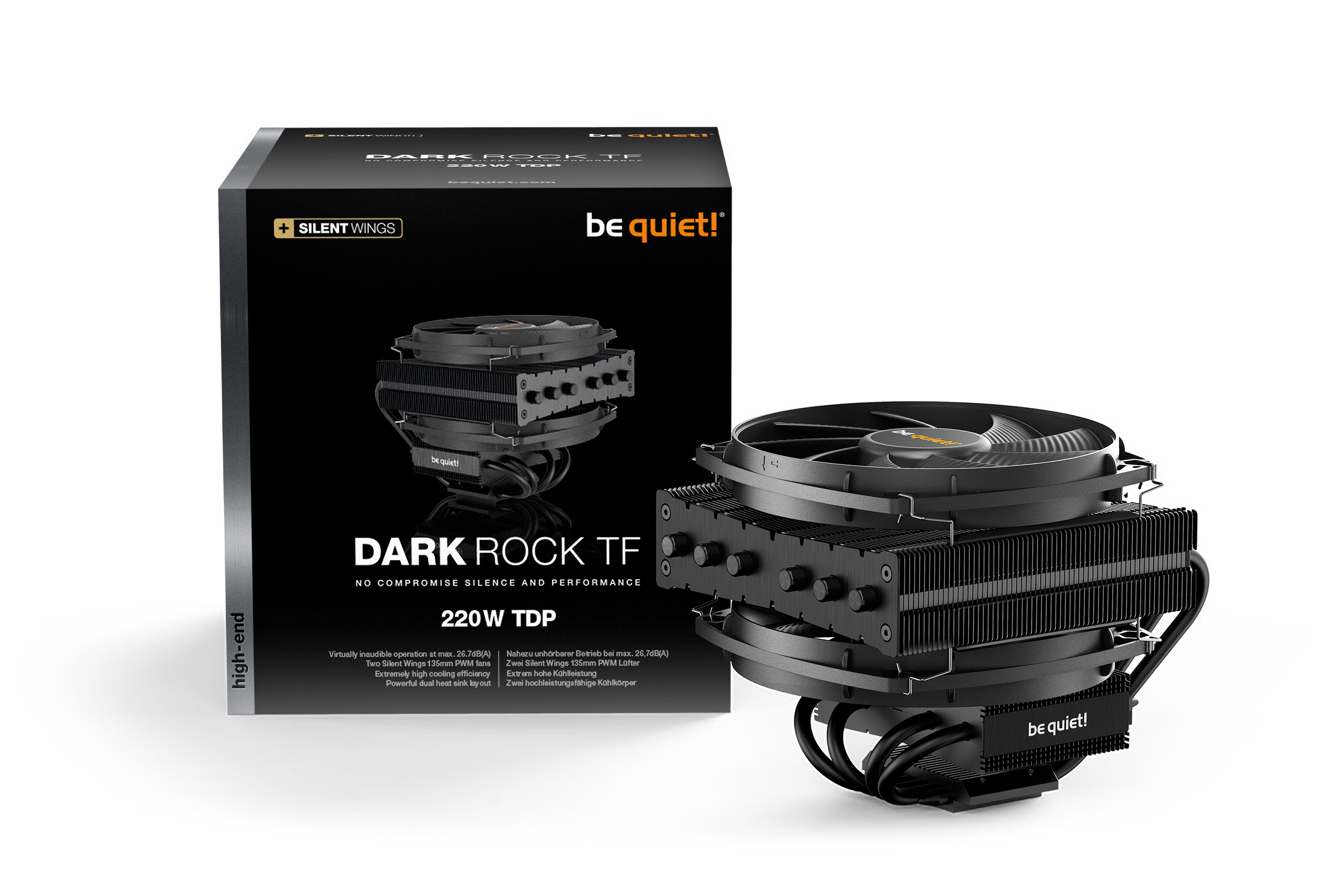 Mit maximal 26,7dB(A) ist er nahezu unhörbar leise und begeistert mit erstklassiger Ausstattung. So sorgen unter anderem zwei vibrationsgedämpfte Silent Wings 135mm PWM Lüfter mit 6-Pol-Motor und Fluid-Dynamic-Lager für besondere Laufruhe. Das Top-Flow-Design, zwei Kühlkörper und sechs 6mm-Heatpipes mit Aluminiumkappen ermöglichen eine effiziente Kühlung auch von übertakteten PCs. Der Dark Rock TF ist ein Top-Flow für Top-Performance.