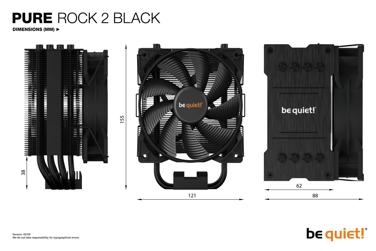 Pure Rock 2 Black is be quiet!’s CPU cooler for silent multimedia and graphics systems. It provides an excellent price-to-performance ratio with 150W TDP cooling efficiency, four 6mm heat pipes, a Pure Wings 2 120mm PWM fan and convenient design for mounting from atop the motherboard.