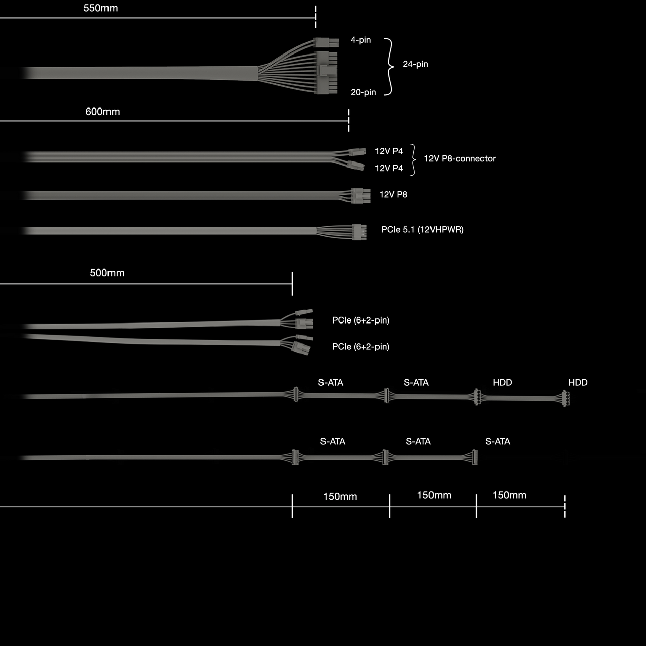 | Flat cables | P4+4, P8, PCIe, drives |