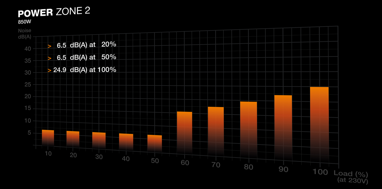 A large Pure Wings 3 140mm fan is keeping Power Zone 2 850W cool. While under low load, the fan turns off completely until its services are needed again for more demanding operations. This post-ventilation requires a short cooldown period of 2-5 minutes to avoid frequent and annoying starts and stops of the fan. Combined with the large fan for active cooling, this power supply is exceptionally silent in all load scenarios.