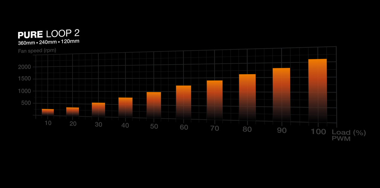 3 Pure Wings 3 120mm PWM high-speed fans provide high air pressure to efficiently cool the liquid of the Pure Loop 2 360mm radiator. The fans also come with a “closed loop motor” function. This feature always keeps a steady fan speed, no matter the resistance – ideal for radiators. Despite their performance, Pure Wings 3 offer very quiet operation. Even at maximum speed, the fans operate at only 36.8dB(A).