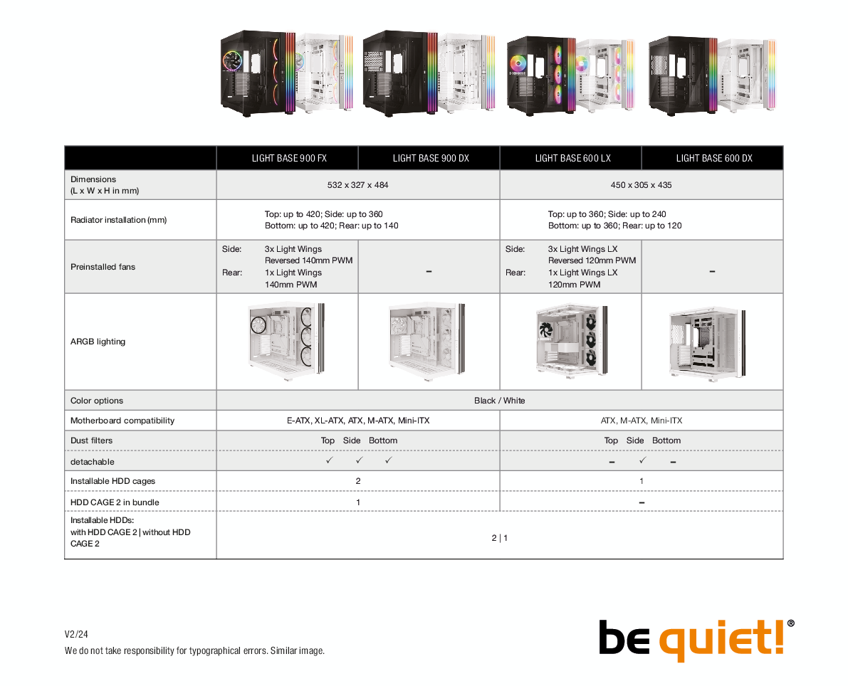 Light Base 900 FX White viene con 4 ventiladores Light Wings preinstalados. Un ventilador está instalado como escape trasero, 3 ventiladores Light Wings 140mm PWM White con aspas invertidas están preinstalados en el montaje lateral. Los ventiladores invertidos se encargan de que su sistema siga llamando la atención cuando se instala como entrada lateral. Sus 7 aspas optimizadas para el flujo de aire no sólo reducen las turbulencias que generan ruido, sino que también garantizan que este ventilador proporcione el rendimiento necesario, incluso en configuraciones exigentes.