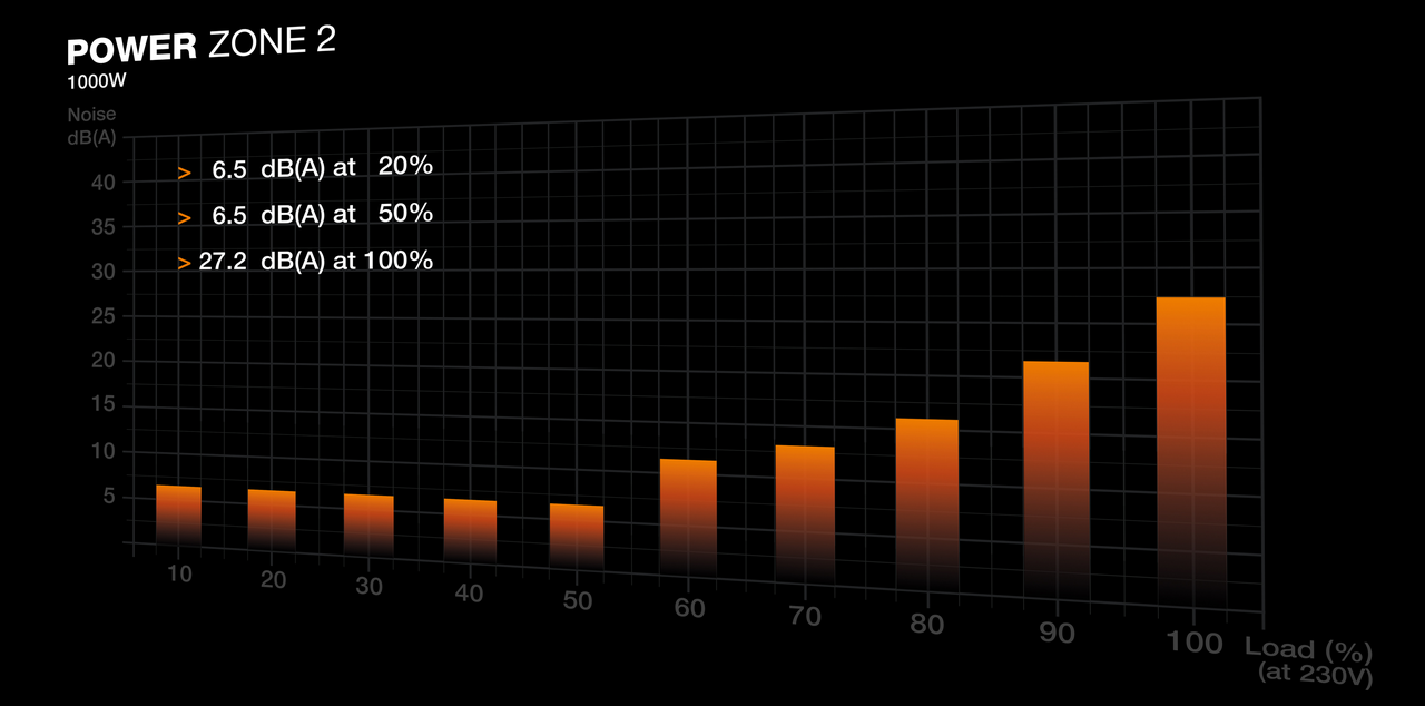 Un gran ventilador Pure Wings 3 de 140 mm mantiene fresco el Power Zone 2 1000W. Mientras está bajo carga baja, el ventilador se apaga completamente hasta que se necesita de nuevo para operaciones más exigentes. Esta ventilación posterior requiere un corto período de enfriamiento de 2-5 minutos para evitar arranques y paradas frecuentes y molestos del ventilador. Combinado con el gran ventilador para enfriamiento activo, esta fuente de alimentación es excepcionalmente silenciosa en todos los escenarios de carga.