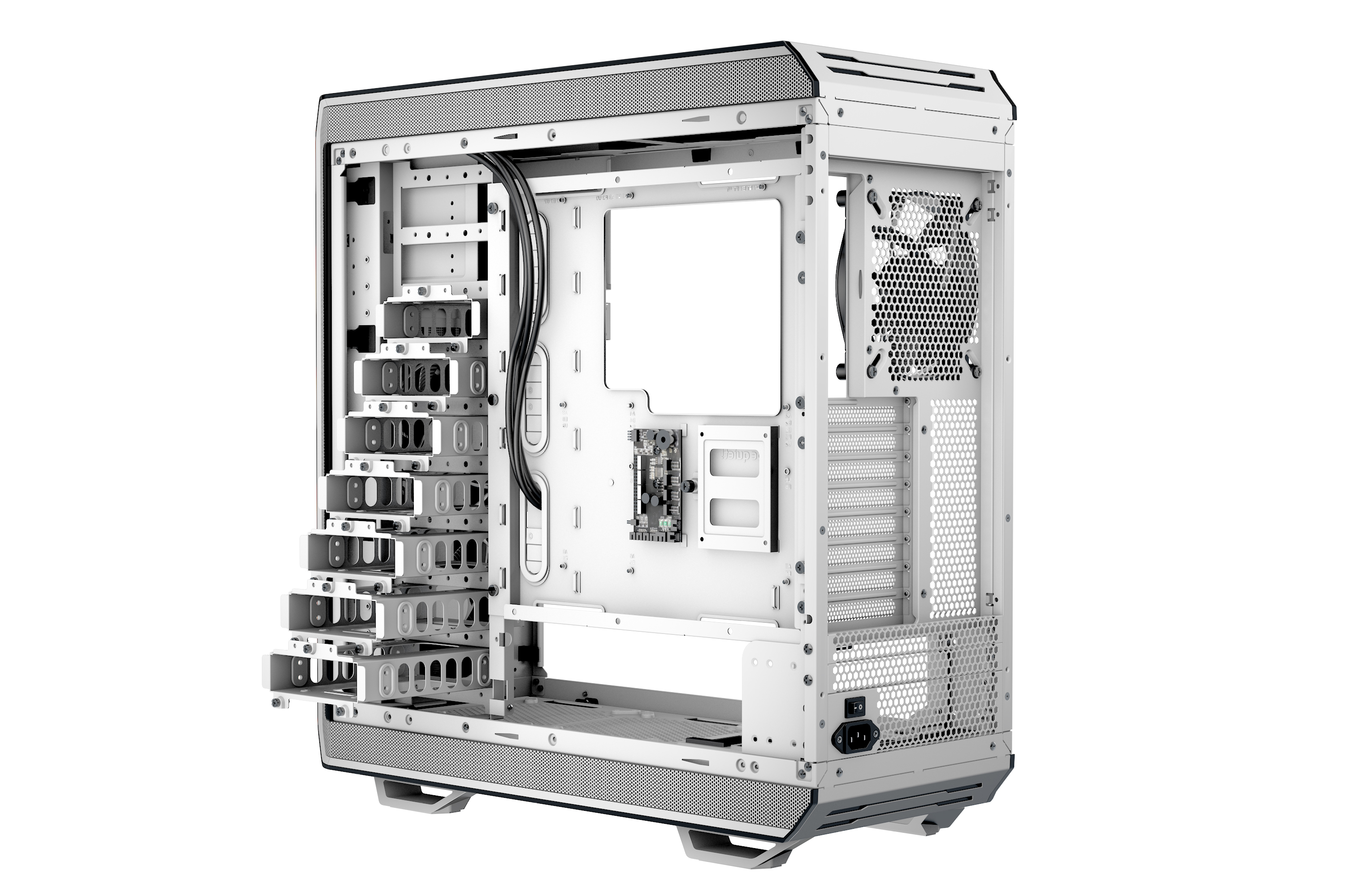 Le plateau découplé de la carte mère s'adapte à vos besoins, totalement repositionnable et utilisable comme table de test. Entièrement compatible avec les cartes mères E-ATX et XL-ATX, vous pouvez le positionner à différentes hauteurs ou l‘installer côté panneau gauche, dans une disposition inversée pour un flux d'air redéfini.