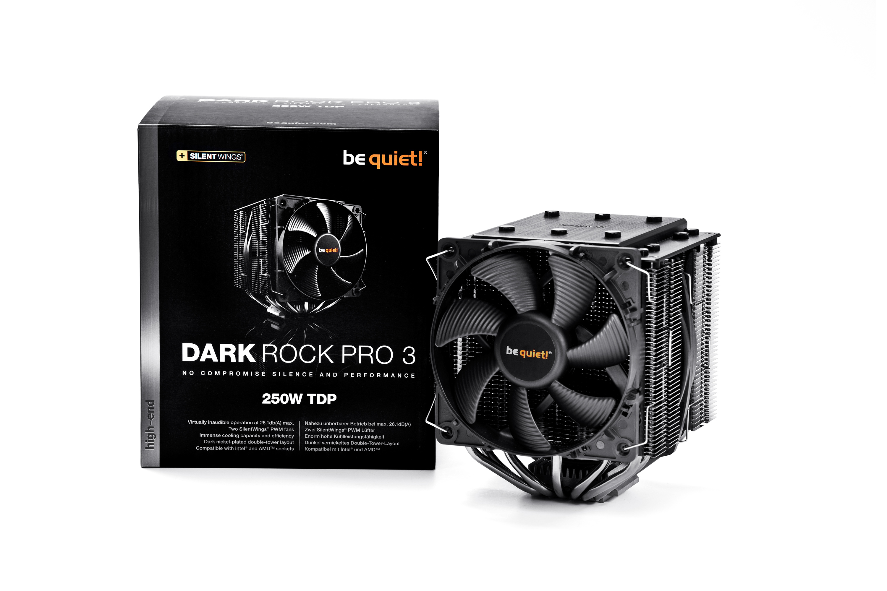 Les Dark Rock Pro 3 offrent la meilleure alliance silence/performance du marché pour une fiabilité irréprochable. Leur capacité de refroidissement, encore améliorée (250 W TDP) et leur fonctionnement parfaitement silencieux (seulement 26.1 dB(A) à vitesse maximale) sont le gage d’un équilibre parfait entre performance et silence, sans aucun compromis.