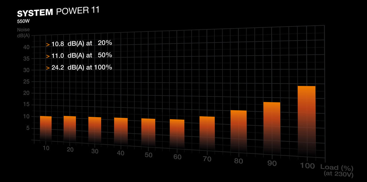 A System Power 11 550W tápban egy hővezérelt, 120 mm-es, minőségi ventilátor dolgozik. Ez biztosítja azt az alacsony zajszintet, amiről a be quiet! ismert, ezen az árszinten figyelemreméltó csendességet kínálva.