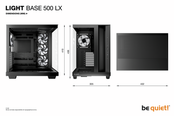 Light Base 500 LX Black posiada 4 preinstalowane wentylatory Light Wings LX. Tylny wentylator to Light Wings LX 120mm PWM, wentylatory z boku to Light Wings LX 120mm PWM z odwróconymi łopatkami. Wszystkie wentylatory są wyposażone w 16 diod LED wewnątrz piasty wirnika, co zapewnia niepowtarzalne podświetlenie ARGB. Odwrócone łopatki wentylatora zapewniają, że ich ładna strona jest widoczna przez cały czas.