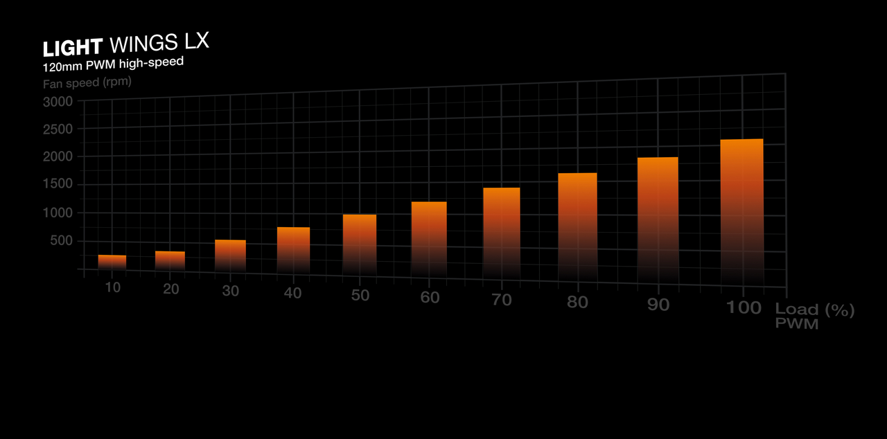 Light Wings LX 120mm PWM high-speed posiada silnik w zamkniętej pętli. Technologia ta jest porównywalna z tempomatem w samochodach. Wentylatory pracujące z oporem, na przykład kratki wentylatora lub chłodnicy, obracają się wolniej. Technologia silnika w pętli zamkniętej stale monitoruje aktualną prędkość wentylatora i w razie potrzeby zwiększa ją do docelowych obrotów. W rezultacie, Light Wings LX 120mm PWM high-speed zawsze pracuje z pożądaną prędkością, bez względu na opór powietrza.