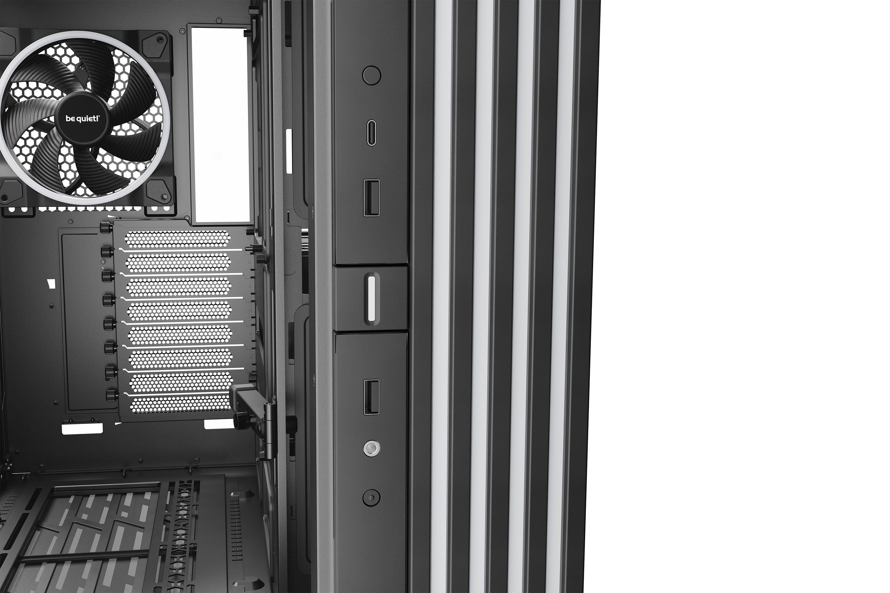 Light Base 900 DX Black 採用靈活的顯示卡支架,巧妙地防止顯示卡下垂。最棒的是:此支架在任何方向都能使用,可與水平或垂直安裝的顯示卡搭配使用。即使您使用大尺寸高階顯示卡,也能獲得整齊的外觀。