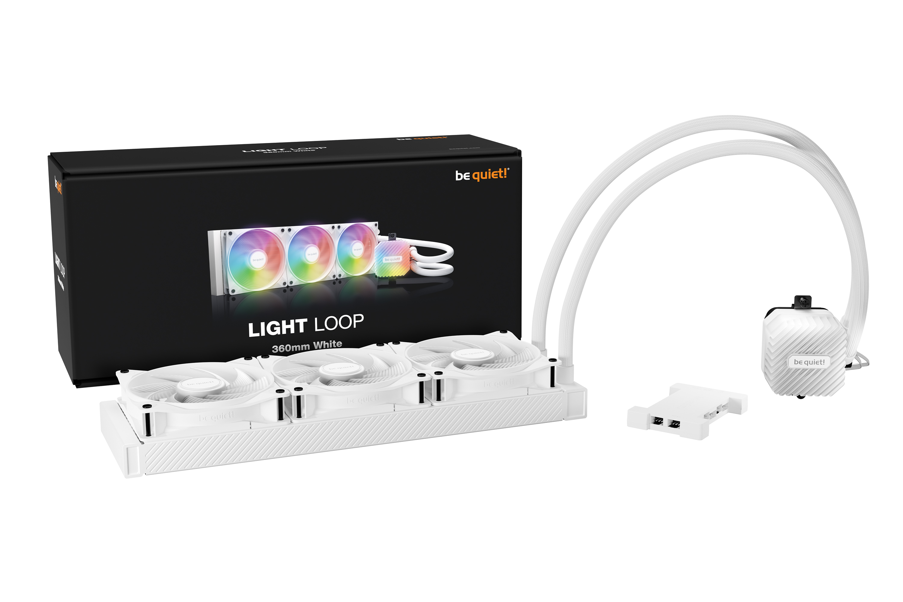 Light Loop 360mm White 在所有黑色系統中都能得到最佳的搭配,這要感謝其统一的白色 外觀。水冷頭和風扇內置的 ARGB LED燈效使得充滿活力的燈光成為焦點。