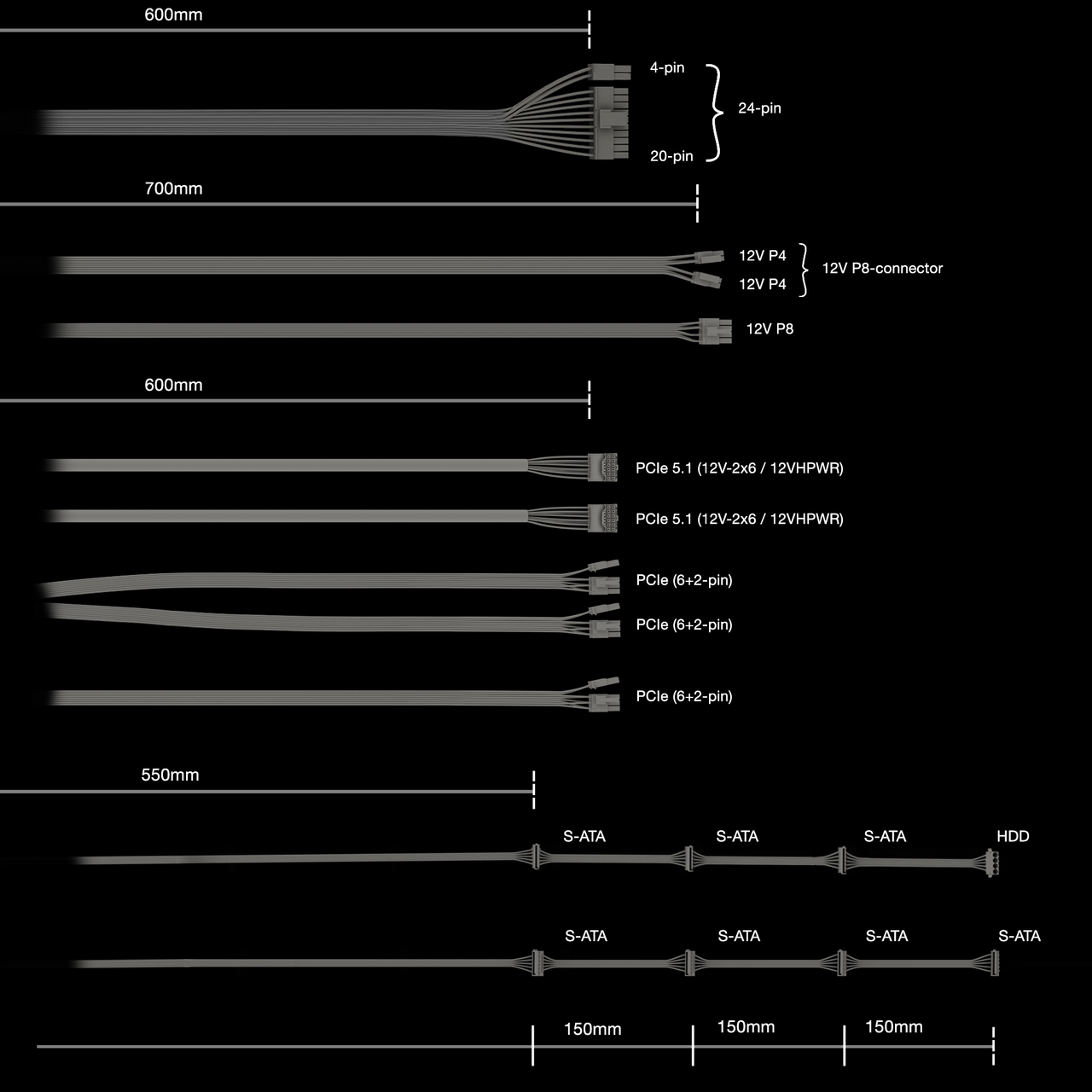Power Zone 2 1200W — це блок живлення стандарту ATX 3.1, що має як 2 сучасні роз’єми 12V-2x6 для відеокарт наступного покоління PCIe 5.1, так і три 6+2-контактні роз’єми PCIe для підтримки GPU поточного покоління. Два кабеля з кутовими 90° роз’ємами 12V-2x6 у комплекті не залишають жодних сумнівів у тому, що цей блок живлення з вами надовго. Power Zone 2 1200W є насправді універсальним рішенням та ідеальним вибором для поточних ПК та high-end систем майбутнього.